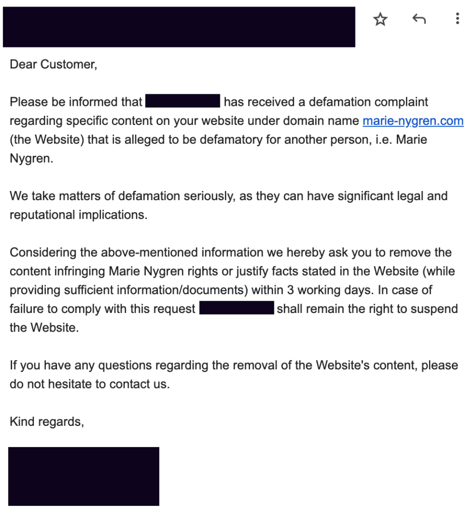 On September 8 2023, Marie Nygren filed a defamation claim against this website.