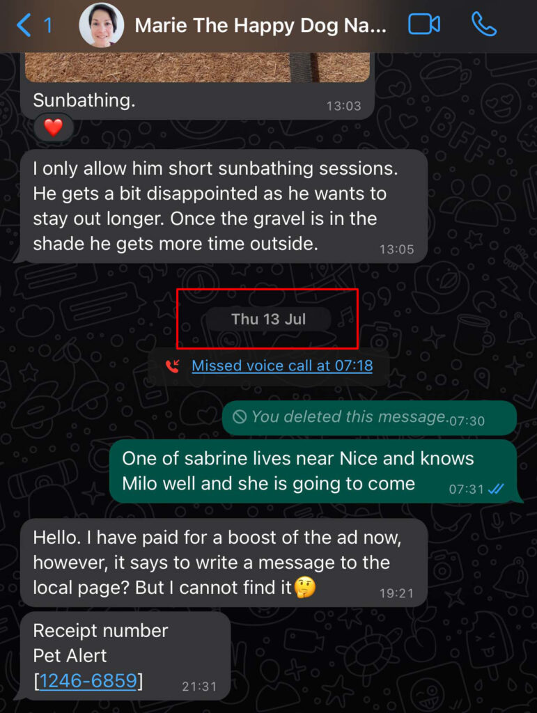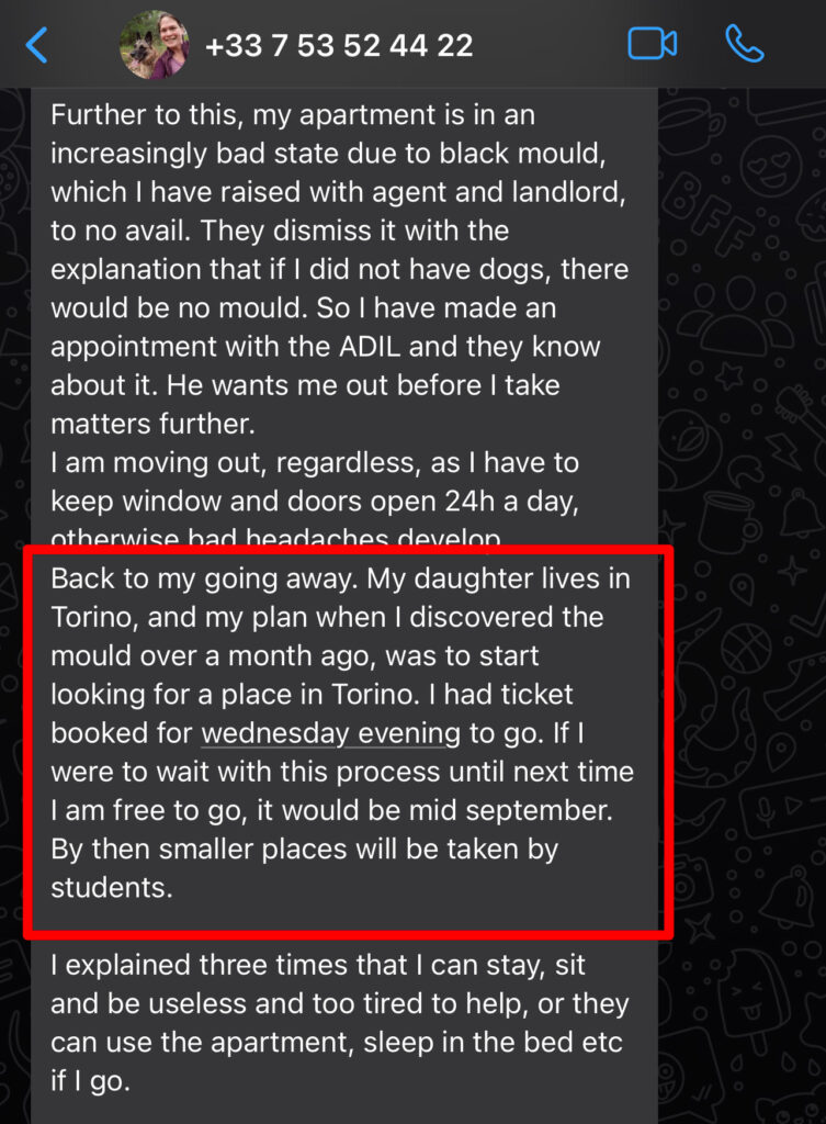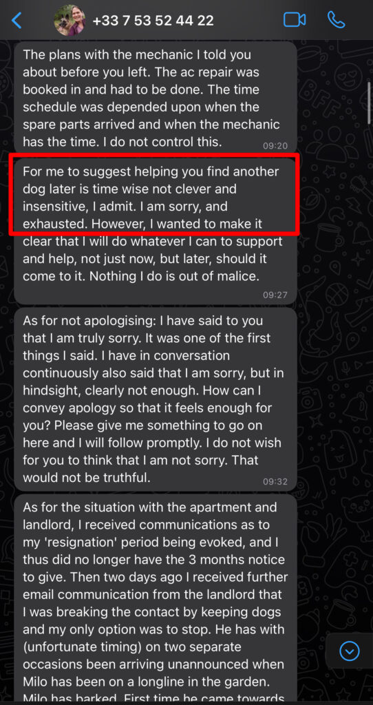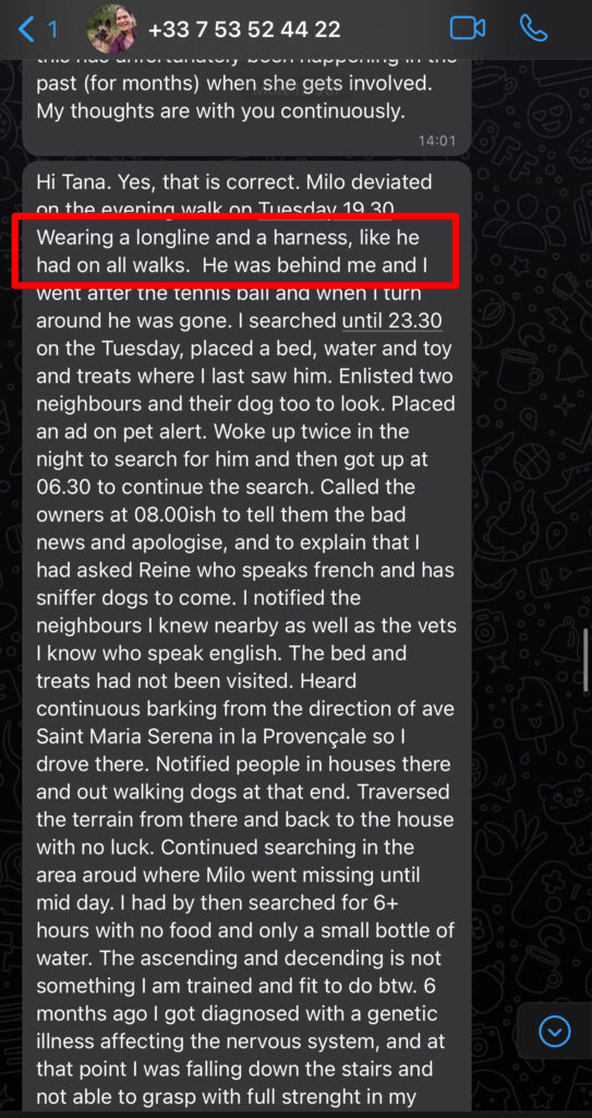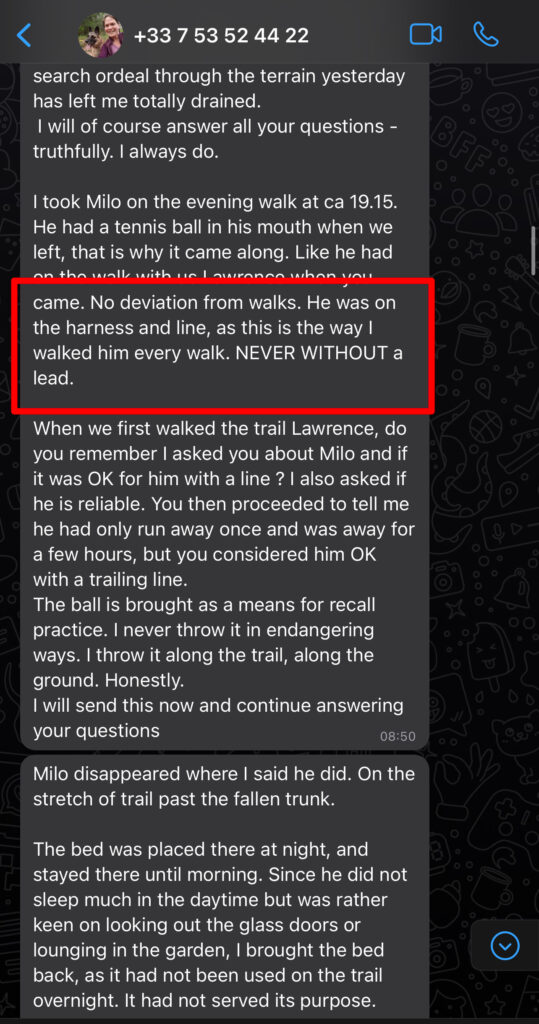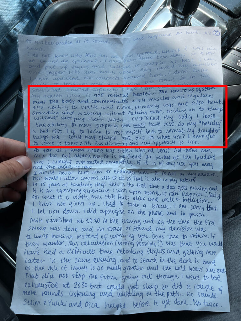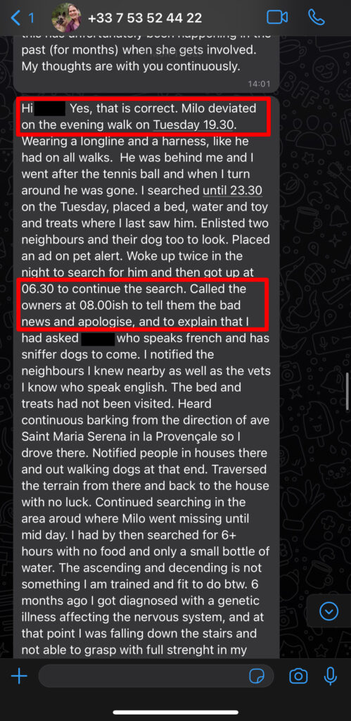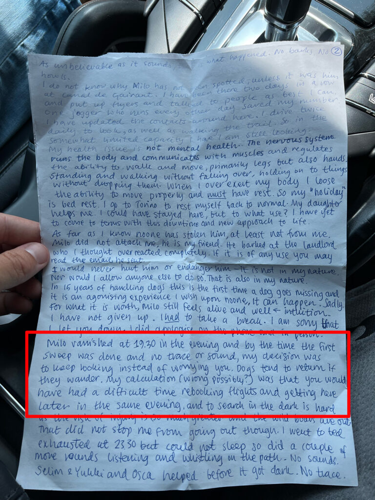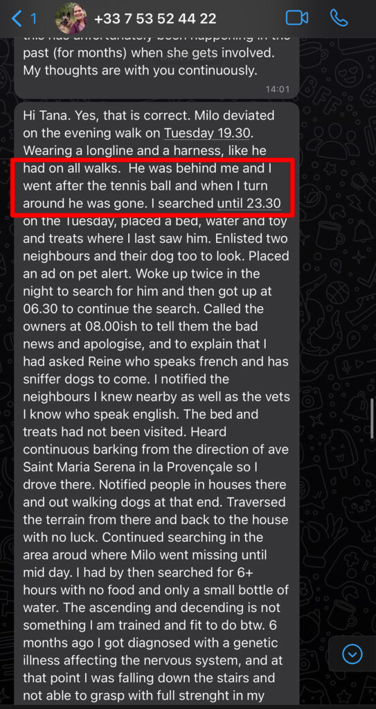 Note the 2 different explanations Marie Nygren gave to Milo’s owners for leaving to Turin. The missing text on page 3 says “Regarding my leaving within 24h – I had no more energy in my body to spend or give“.