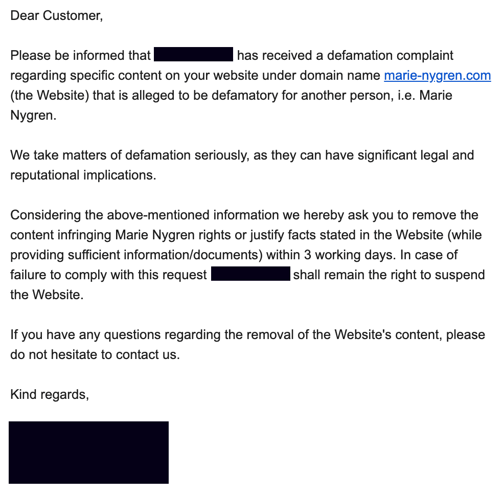 On September 8 2023, Marie Nygren filed a defamation claim against this website.