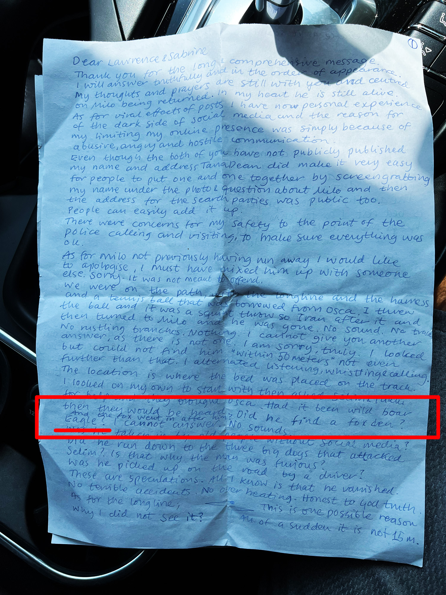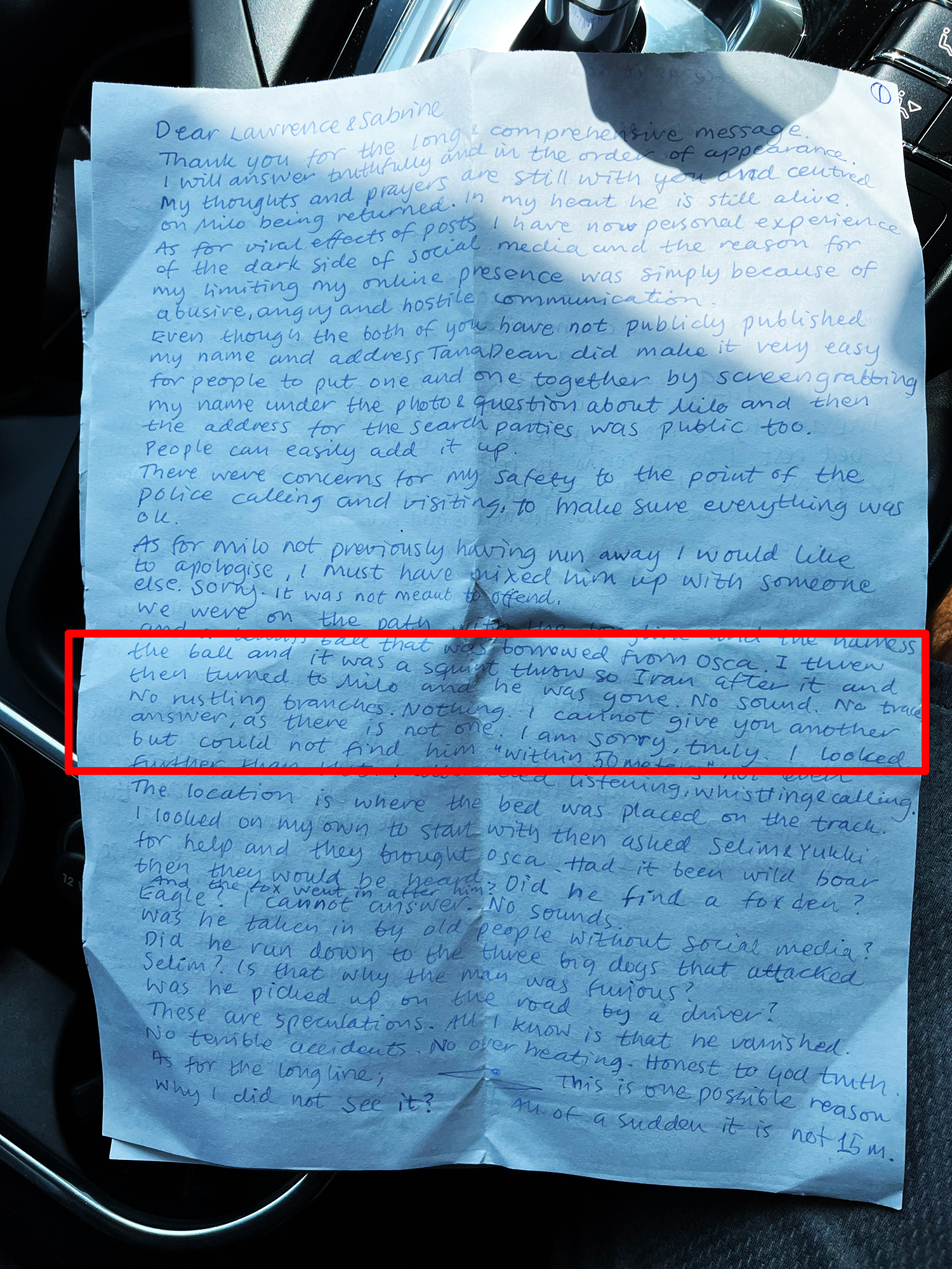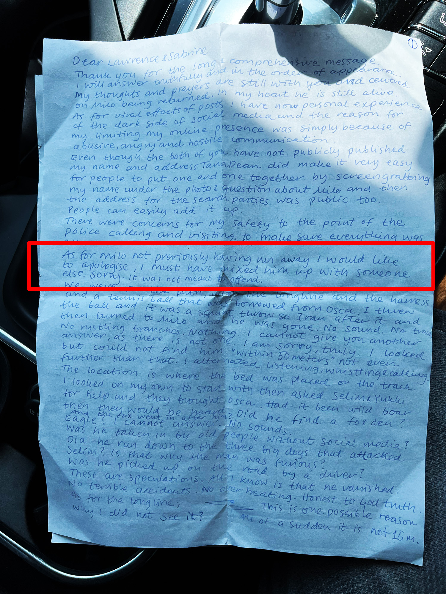 Note the 2 different explanations Marie Nygren gave to Milo’s owners for leaving to Turin. The missing text on page 3 says “Regarding my leaving within 24h – I had no more energy in my body to spend or give“.